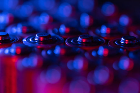 Closeup of positive ends of discharged batteries AA sizes, macro shot, selective focus. Used battery