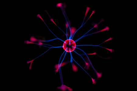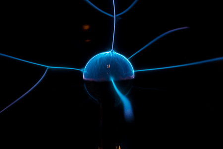 A plasma ball with a blue and purple lightning in the center.
