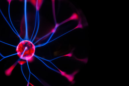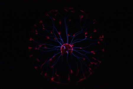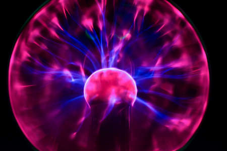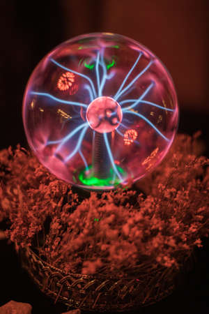 Close up - plasma ball with many energy rays inside. Electricity, education, science, futuristic, technology and physics concept