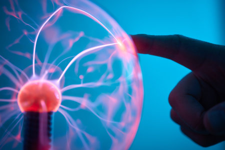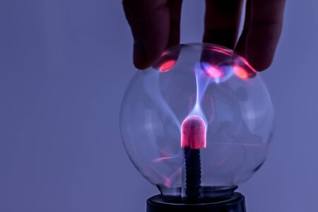 Plasma lamp on neutral background. Fingers of a man attracting the luminous electric flow. Crystal ball with electricity and light. Electricity made light.