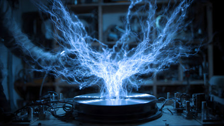 Close up of a Tesla coil experiment with electrical discharge. High voltage, science and technology concept.
