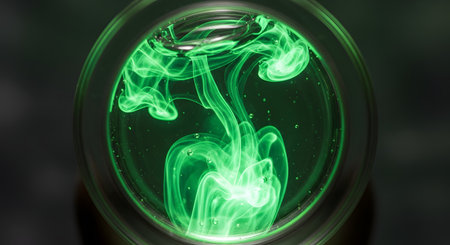 A top-down, close-up view of a glass container filled with a glowing, vibrant green liquid. Wisps of smoke, plasma, or dye are swirling inside, creating an abstract, magical, or scientific pattern. This represents a potion, toxic substance, or energy.
