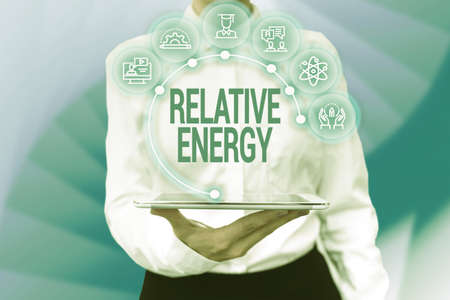 Text caption presenting Relative Energy. Internet Concept quantitative property that must be transferred to an object Lady Uniform Standing Tablet Hand Presenting Virtual Modern Technology