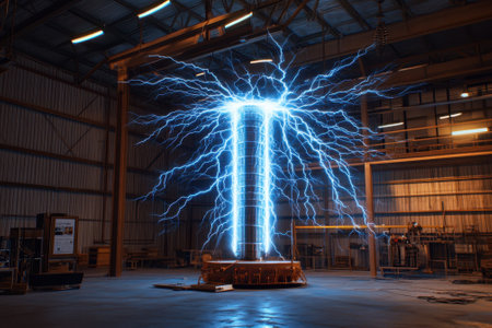 A large Tesla coil produces stunning electric arcs in a bustling workshop during a live demonstration.