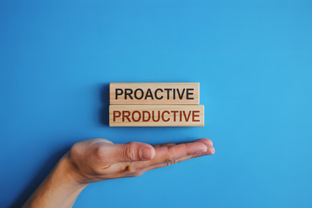 Minimalist flat lay of wooden blocks displaying 'PROACTIVE' and 'PRODUCTIVE' on vibrant blue background, ideal for business, productivity, and motivation themes.