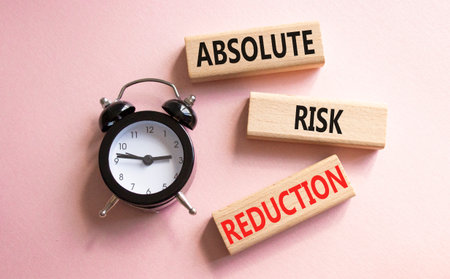 Absolute Risk Reduction symbol. Concept words Absolute Risk Reduction on wooden blocks. Beautiful pink background with alarm clock. Business and Absolute Risk Reduction concept. Copy space.