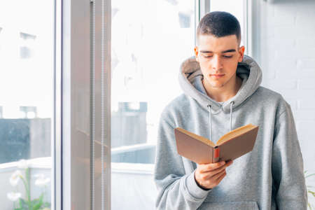 young man reading book at home by the window
