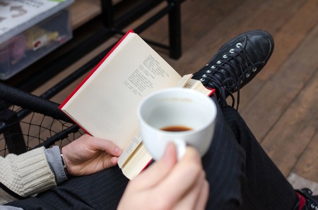 The guy with a cup of coffee reads a book outdoors