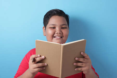 Portrait of happy smart fat Asian student boy smiling when reading a book, against blue background, educational concept