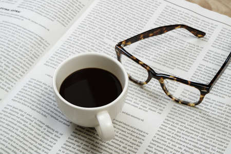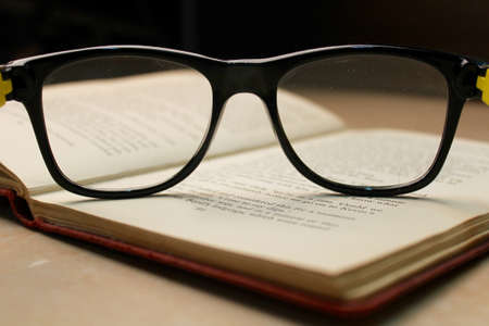 An open book with glasses on top of the pages. Selective focus points. Blurred background