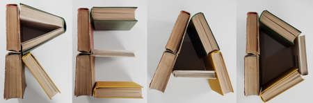 Stack of open vintage hardcover books and retro reading glasses on top. Selective focus.