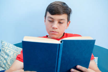 Young boy sitting by the desk and read the book. Study at home during quarantine