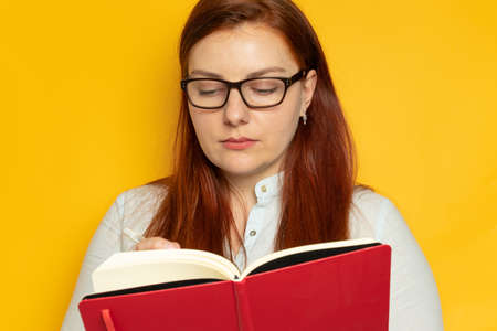 Concentrated beautiful young woman teacher with glasses writes in a notebook on a yellow wall background