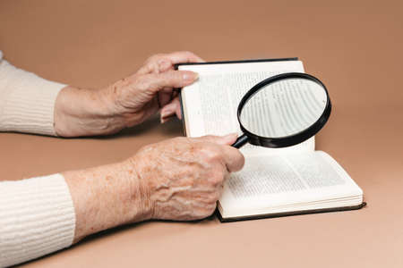 Wrinkled hands of a senior woman are reading a book with magnifier glass. Beige background. The concept of investigation and poor eyesight.