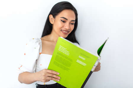 Beautiful Asian woman smiling reading a book / Studying at home.