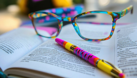 Colorful eyeglasses and pen are lying on an open book, suggesting a studious atmosphere focused on learning and education