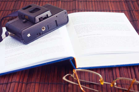 An open book with glasses on top of the pages. Selective focus points. Blurred background