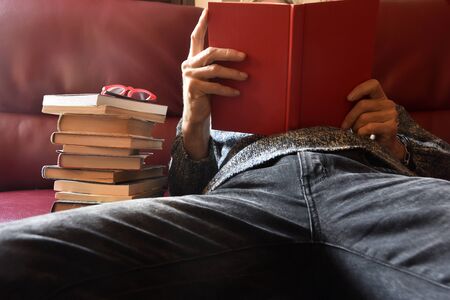 Selective focus of A woman lies on a sofa with a book covering his face in the living room.