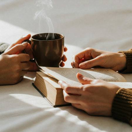 An open notebook with eyeglasses and a mug sits bathed in warm light.