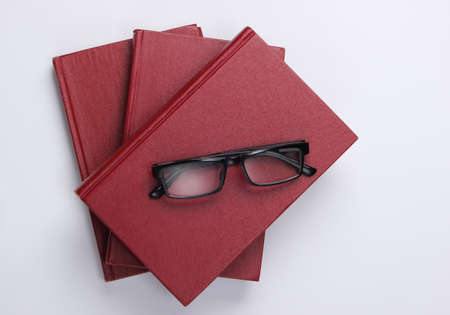 Stack of open vintage hardcover books and retro reading glasses on top. Selective focus.