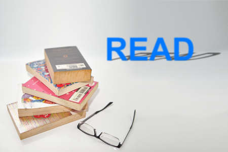 Close up to READ BOOKS lettering over blank notebook at blue navy background. Reading and study concept photography