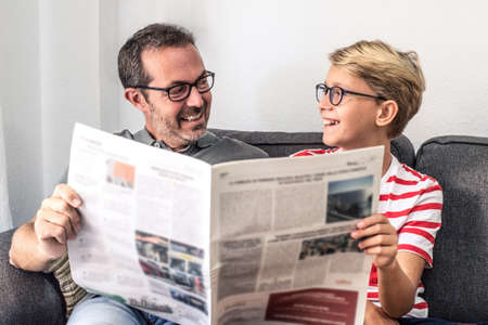 Happy young boy and his father reading a newspaper at home. Blonde child reads news on a journal with dad smiling together. Teen looking last news on a paper magazine. Information, culture, concept.