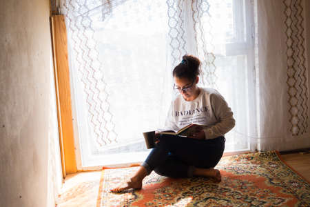 A brunette girl with a tail on her head and glasses for a sight, sits on the floor near a large window on the carpet, drinks coffee and reads a book