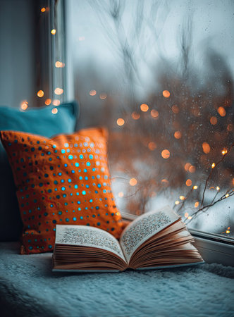 An open book sits near decorative pillows placed by a window, illuminated by warm bokeh lights. The scene features vibrant orange and blue pillows with soft textures, and bright window light. This image is suitable for illustrating themes related to reading, comfort, or home decor. The image may be used for a wide range of editorial or commercial purposes.