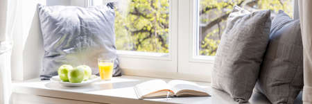 Real photo of windowsill with three grey pillows, open book, green apples on plate and orange juice in glass