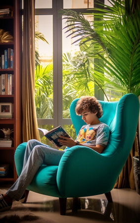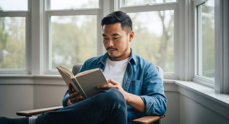 Young man read book, A cozy minimalist reading nook with natural light.