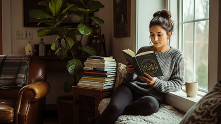 girl reading a book by the window, holding cup of tea