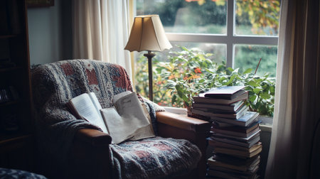 A serene reading nook featuring a comfortable chair, an open book, and a soft blanket, illuminated by gentle light, creating a perfect environment for relaxation and reflection.