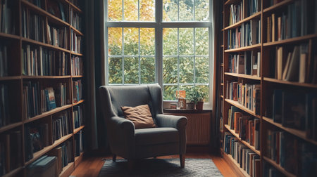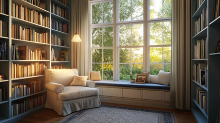 This inviting reading nook features stylish bookshelves, soft cushions, and ample natural light, creating a perfect space for relaxation and inspiration.