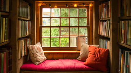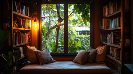 A cozy reading nook with soft lighting, plush cushions, and a window view of a lush garden, providing a charming and relaxing atmosphere.