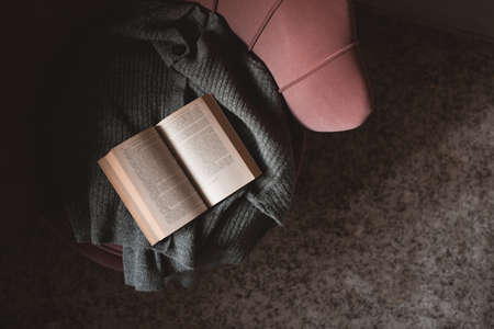 Open paper book with knitted wool fabric on cozy accent chair in room close up.