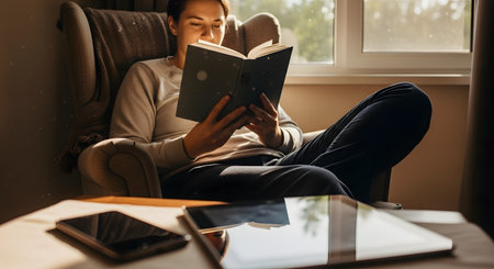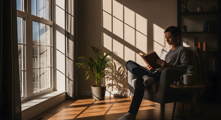 A woman sits peacefully by a window reading a book, illuminated by the warm golden glow of a sunset. The scene captures a moment of relaxation, solitude, and the enjoyment of literature at home.