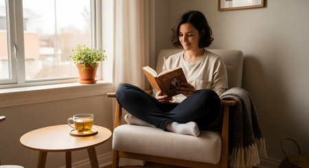 A woman peacefully reads a book while sitting comfortably with her legs crossed in a modern armchair next to a window. A warm cup of tea sits on a small table beside her, creating a cozy and serene scene of relaxation, self-care, and leisure at home.