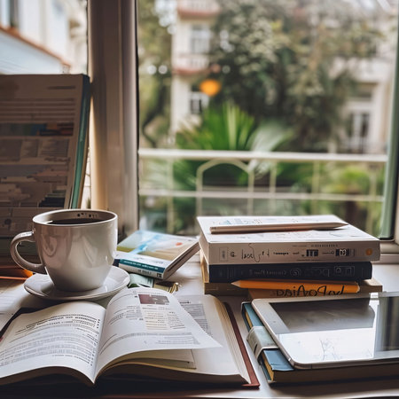 A cozy reading nook featuring an open book, a cup of coffee, and a beautiful view of nature through the window, inviting warmth and relaxation.