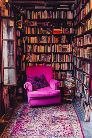 Cozy Reading Nook Pink Armchair, Bookshelf, and Colorful Rug in a Bookworms Paradise.