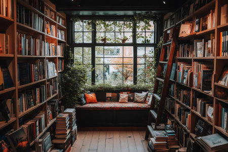 Comfortable window seat surrounded by bookshelves and plants, creating a peaceful reading space with natural light