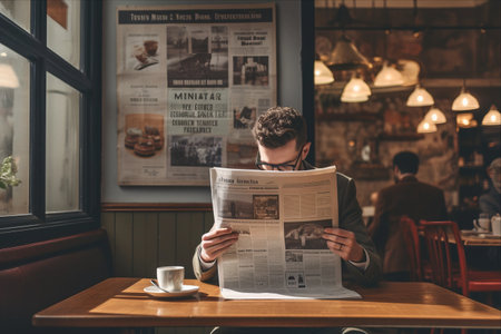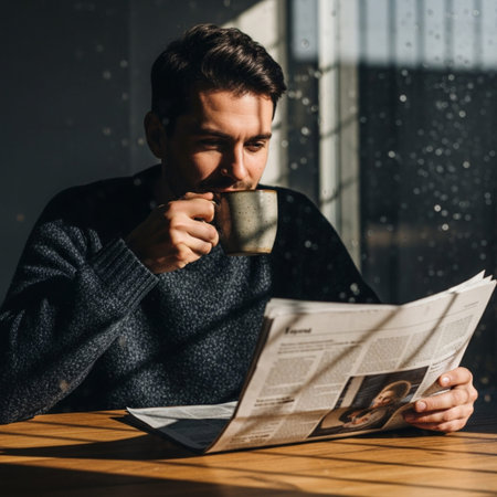 A man relaxes in a cozy indoor space, savoring a warm coffee while browsing through his favorite newspaper in a tranquil, stylish setting.