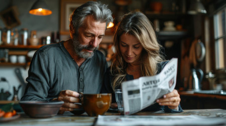 Mature couple in cozy pajamas having morning coffee while reading a newspaper at home. A warm, intimate moment in a rustic kitchen setting.