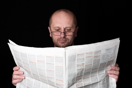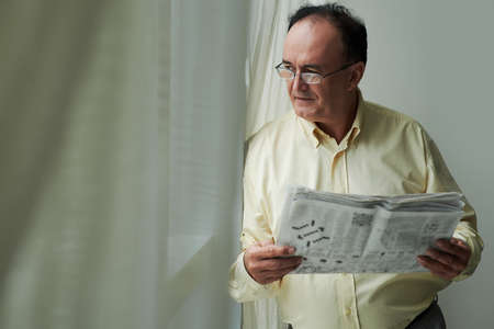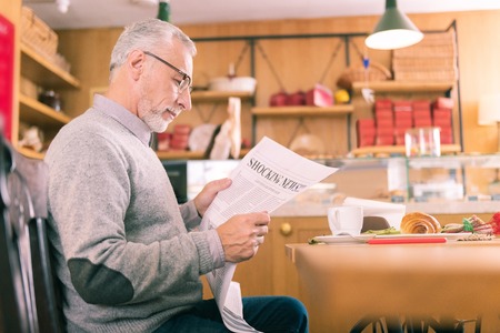 Local newspaper. Mature grey-haired man feeling really curious and involved in reading local newspaper