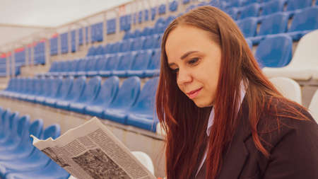 A woman in a business suit reads a newspaper while sitting at the stadium.