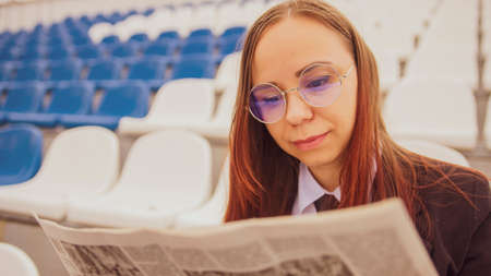 A woman in glasses and a business suit reads a newspaper while sitting at the stadium.