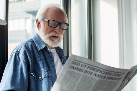 Portrait of old bearded pensioner enjoying newspaper at home. He is cheerful and interested