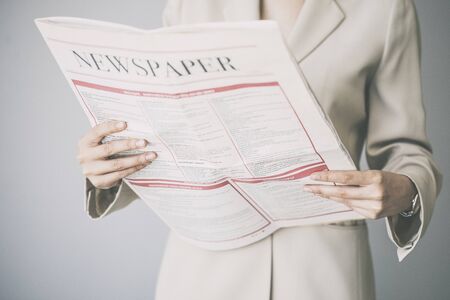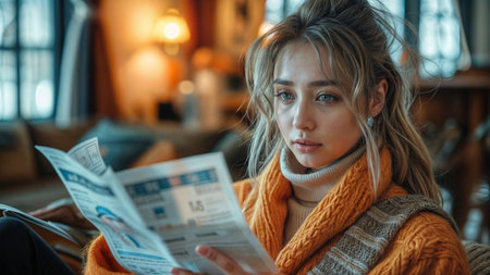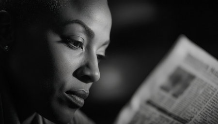 A focused woman holds a newspaper, her attention captured by printed words, with soft shadows highlighting a quiet, contemplative moment.