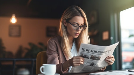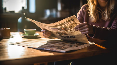 Young woman reading a newspaper in a cafe, close-up.generative ai