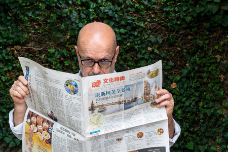 Udine, Italy. July 15 2019. a western man reading the Chinese Epoch Times newspaper