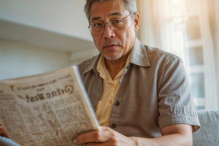 Closeup of shock and unhappy Asian elderly pensioner man with glasses at home reading bad news in newspaper
